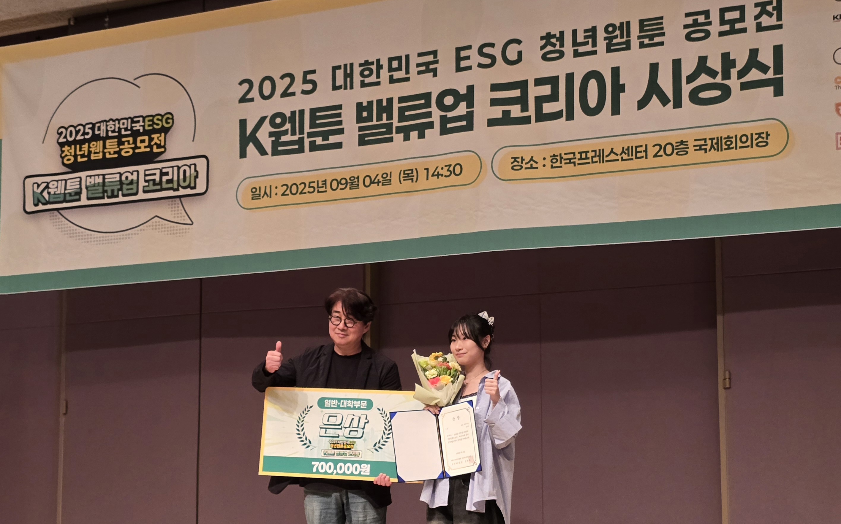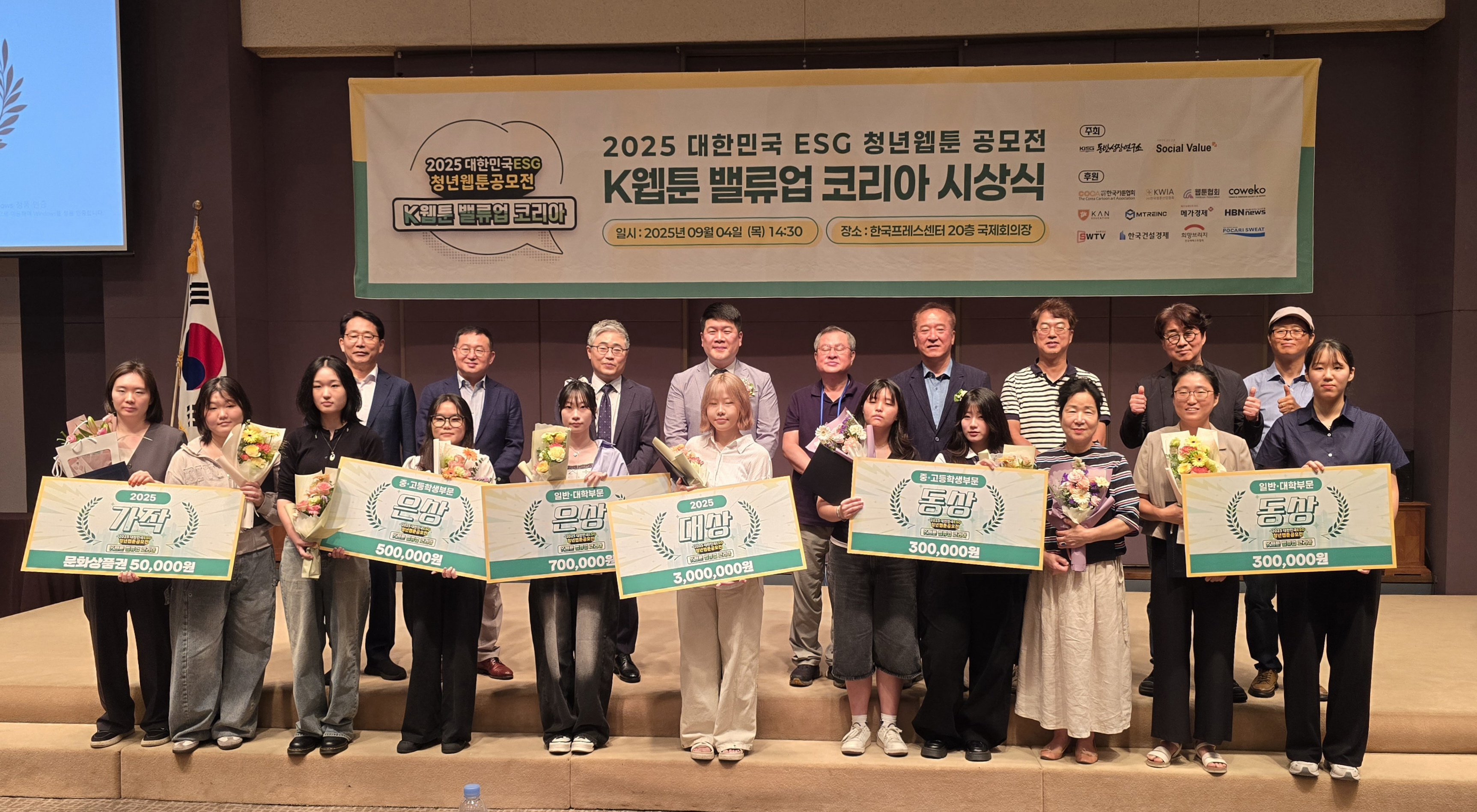 2025.09.04. 소셜벨류 ESG 웹툰공모전 시상식 작성자: 사무국장 작성일: 2026-04-19 02:07 조회: 8 소셜벨류 ESG 웹툰공모전 시상식 ← 다음글: 2025.09.25. 만화·웹툰을 사랑하는 국회의… → 이전글: 2025.08.14. ‘콘텐츠 불법유통 대응을 위… 목록