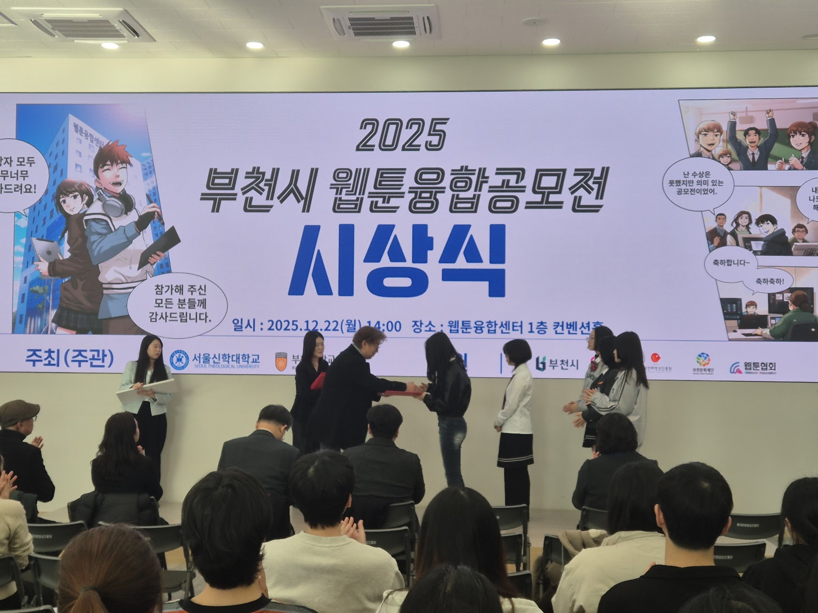 2025.12.22. 서울신학대, 부천대 주관 ‘부천시 웹툰융합공모전’ 시상식 작성자: 사무국장 작성일: 2026-04-19 02:15 조회: 12 서울신학대, 부천대 주관 ‘부천시 웹툰융합공모전’ 시상식 ← 다음글: 2025.12.19. 2025년 웹툰협회x한국만화스… → 이전글: 2025.11.03. 제25회 만화의 날 기념식 참석 목록