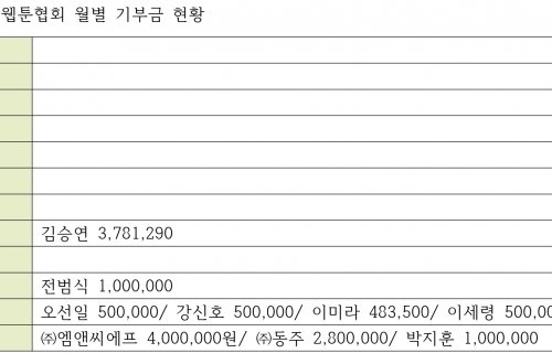 웹툰협회 기부내역 ✔ 뷰어로 보기 2026.01.09 12:13 2025년 기부금 현황 사무국 조회 수 10 추천 수 0 댓글 0 ? 단축키 Prev이전 문서 Next다음 문서 크게 작게 위로 아래로 댓글로 가기 인쇄 첨부 2025년_웹툰협회 전자기부금영수증 발급내역.xls 2023년 웹툰협회 기부금 현황 Next 2023년 웹툰협회 기부금 현황 2024.03.04by 0 추천 0 비추천 Atachment 첨부 '1' 2025년_웹툰협회 전자기부금영수증 발급내역.xls, 목록 Facebook Twitter Google Pinterest 위로 아래로 댓글로 가기 인쇄 첨부 ✔댓글 쓰기 에디터 선택하기 ✔ 텍스트 모드 ✔ 에디터 모드 ? 댓글 쓰기 권한이 없습니다. 로그인 하시겠습니까? 목록 위로